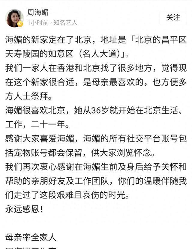 经由周海媚家东谈主的三想尔后行,周海媚最终被安葬在了北京。因为周海媚从年青就来到北京打拼全球博彩公司排行,在那儿生计了21年,对这里充满情态,寰宇以为留在这里周海媚应该也瑕瑜常的雅瞻念。